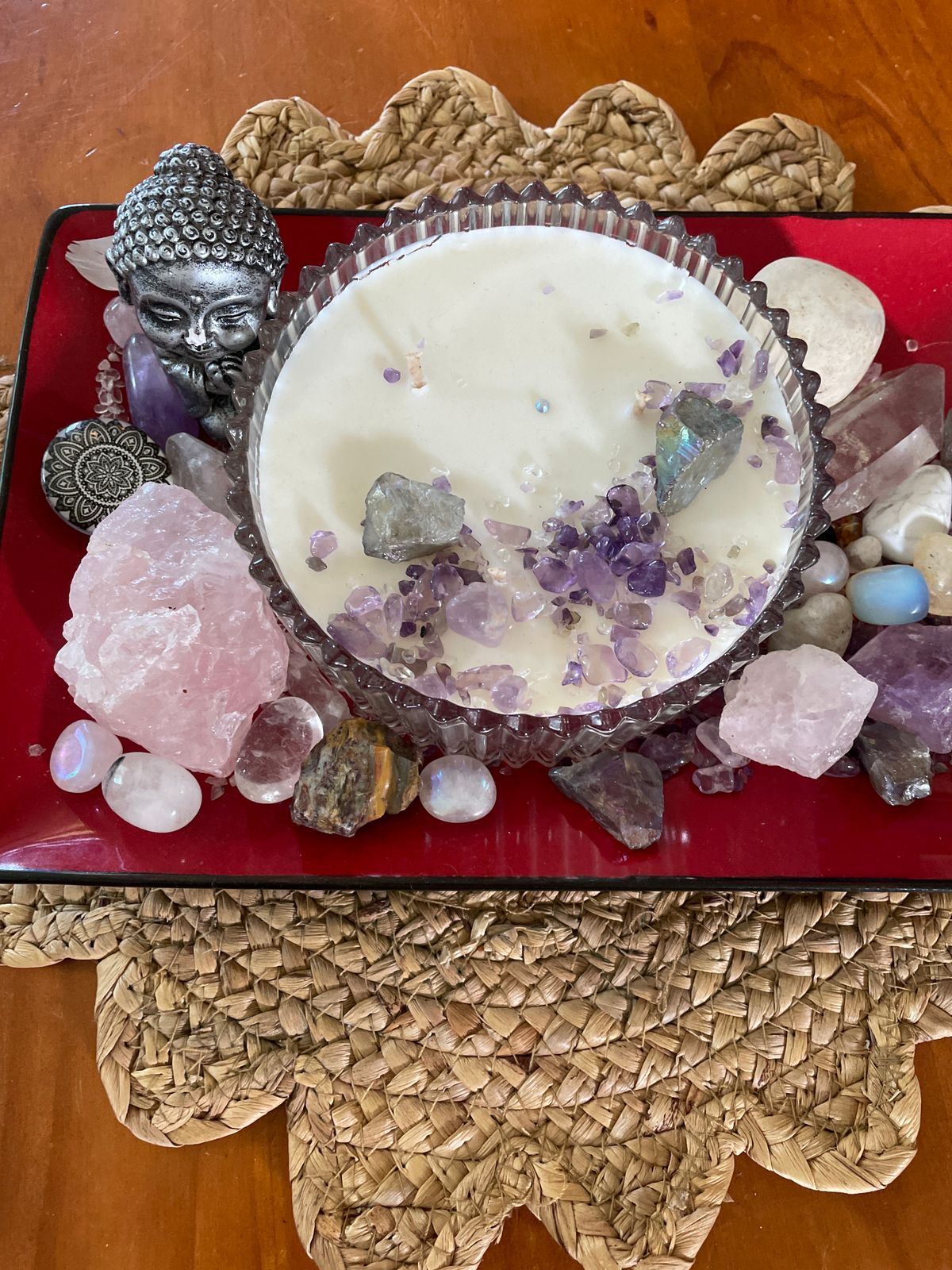 This Extra Large elegant candle is hand-poured in Australia, supplied with stunning crystal glassware, comes complete with a Lid and is beautifully boxed to provide the perfect gift for any occasion. Handmade in Australia with hand selected Crystals & Stones selected with love & attention. Using only the best quality Australian Made fragrances each Candle fills the room with incredible uplifting, gorgeous Australian scent making this candle a perfect addition to your self care routine.