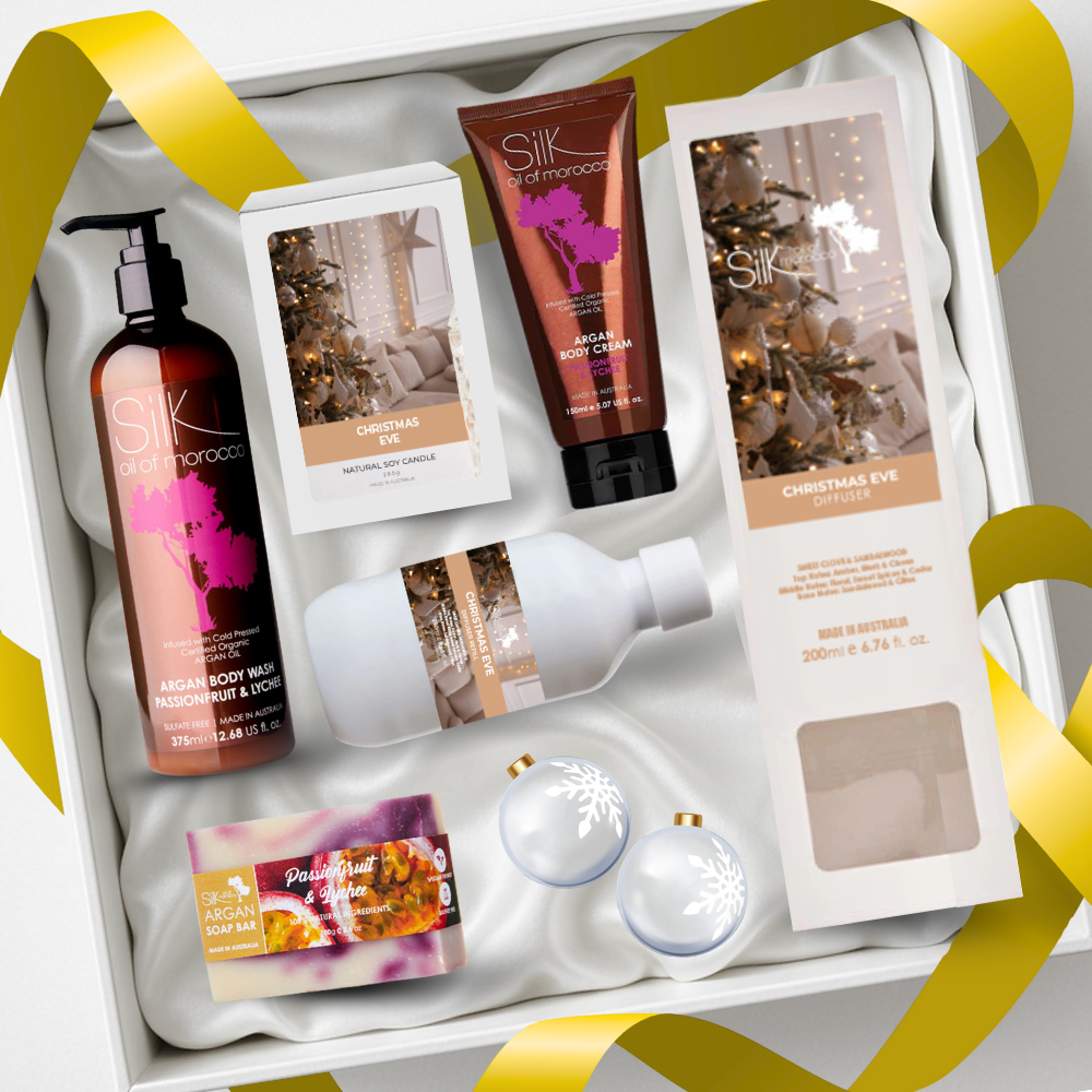 Unwind and indulge in the magic of the holidays with the Christmas Eve Hamper — a luxurious gift set that perfectly balances festive warmth and tropical freshness. This elegant collection pairs the soft, comforting aroma of Sweet Clove & Sandalwood with the fruity vibrance of Passionfruit & Lychee, creating the ultimate Christmas indulgence for body and home 💛